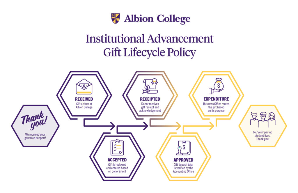 This policy provides consolidation of procedures, donor rights, documentation requirements and legal adherences for gifts processed by the Advancement Finance (AF) team within the Office of Institutional Advancement at Albion College. This document describes a gift’s progression from initial receipt in Advancement Finance to its final steps in the Student Accounting Office (formerly known as the Accounting Office) and the Business Office. Lastly, this policy outlines what specific gift information is available to authorized Albion College staff and the schedule for receiving that information. For more information on how a gift is being spent and the current balances of specific funds, please contact the Business Office.